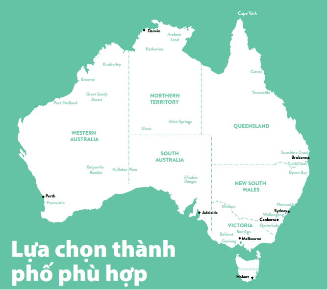 Đất nước Úc nói chung có lối sống tương đối thoải mái và nhiều điều thú vị để bạn trải nghiệm. Nhưng, một số nơi tập trung vào nghệ thuật hơn (Melbourne và Adelaide), trong khi những nơi khác thiên về lối sống ngoài trời (Sydney, Gold Coast, Perth và Wollongong). Hãy suy nghĩ xem điều gì quan trọng với bạn và bạn thích làm gì trong thời gian rảnh rỗi.